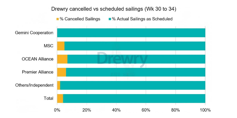 運(yùn)力調(diào)整方面,盡管主要東西向航線的停航數(shù)量正在減少,7月環(huán)比下降56%,8月再降8%,但整體運(yùn)力水平仍處于高位。數(shù)據(jù)顯示,在第30周至第34周(7月21日至8月24日期間)這五周內(nèi),跨太平洋、跨大西洋以及亞洲-北歐及地中海三大航線共計(jì)716個(gè)航次中,預(yù)計(jì)將有29個(gè)航次被取消,取消率為4%。其中,停航主要集中在跨太平洋東行航線(占比66%),其次是亞洲-北歐及地中海航線(21%)和跨大西洋西行航線(13%)。與此同時(shí),未取消航次的比例正在提升,預(yù)計(jì)96%的航次將按計(jì)劃開(kāi)航。