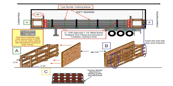 長條型鋼材貨物裝載對端壁和箱門要特別注意防護,對集裝箱兩端一定要加襯墊,貨物與集裝箱有空隙必須支撐、塞緊。與底板接觸如采用方木撐墊,建議木條斜跨集裝箱多根底橫梁,避免集中受力產(chǎn)生損失。如因捆扎裝箱不規(guī)范導(dǎo)致的箱損、貨損,所有責任及費用均要承擔的。在此,我們整理了長條型鋼材貨物裝載方法建議,供您參考。