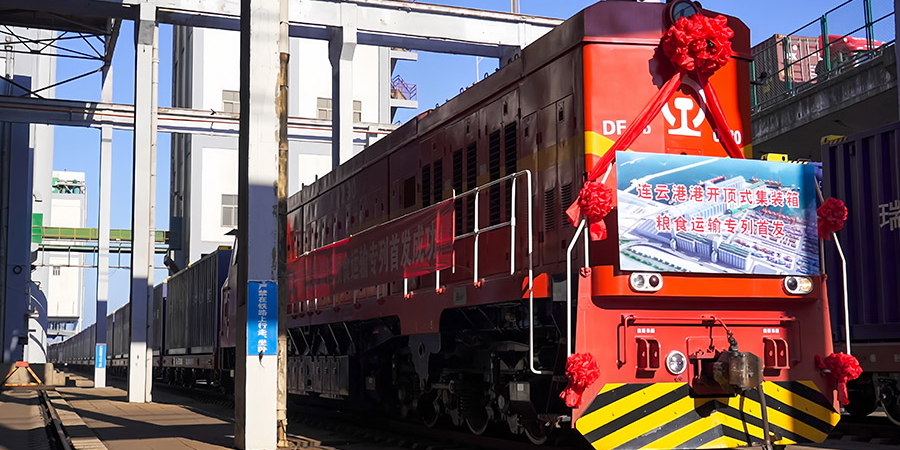 隨著一聲汽笛鳴響,全國(guó)首列開(kāi)頂式集裝箱糧食運(yùn)輸專列緩緩駛出連云港港,駛往中儲(chǔ)糧河南省儲(chǔ)備點(diǎn)。該專列采用20英尺自流式頂開(kāi)箱,實(shí)現(xiàn)散糧大批量、高效率運(yùn)輸,零損耗、門(mén)到門(mén)服務(wù)。