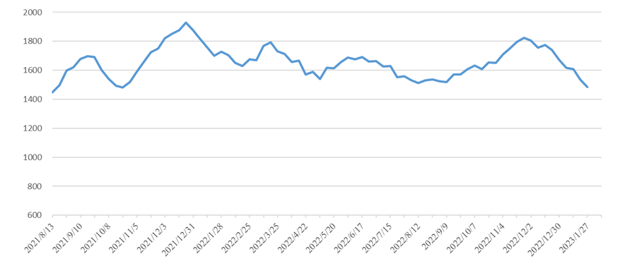華北區(qū)域:春節(jié)假期及寒潮影響,市場運量保持低位以存貨為主。本期華北指數(shù)報收1221點,環(huán)比下跌111點,跌幅8.33%,其中華北至華南指數(shù)報收1222點,環(huán)比下跌141點,跌幅10.34%。