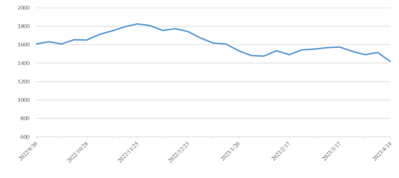市場需求較淡運(yùn)量處于較低水平,本期(2023年4月08日至4月14日)中國內(nèi)貿(mào)集裝箱運(yùn)價指數(shù)較上期震動下跌。