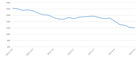 市場持續(xù)下行,本期(2023年5月06日至5月12日)中國內(nèi)貿(mào)集裝箱運價指數(shù)環(huán)比同比下跌